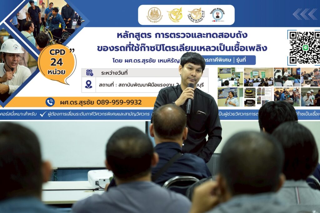 ในวันที่ 10–12 พฤศจิกายน 2568 ที่ผ่านมา สาขาวิชาวิศวกรรมเครื่องกล ร่วมกับ บริษัทหงษ์ทองเอ็นจิเนียร์ และ สถาบันพัฒนาฝีมือแรงงาน 2 สุพรรณบุรี ได้จัดอบรมในโครงการ “การตรวจและทดสอบถังของรถใช้ก๊าซปิโตรเลียมเหลวเป็นเชื้อเพลิง” สำหรับวิศวกรภาคีพิเศษ รุ่นที่ 8 โดยได้รับเกียรติจาก ผศ.ดร. สุรชัย เหมหิรัญ และอาจารย์ฐานทัพ นนท์ตุลา อาจารย์ประจำสาขาวิศวกรรมเครื่องกล มาทำหน้าที่เป็นวิทยากร ถ่ายทอดทั้งความรู้พื้นฐานและทักษะปฏิบัติ ให้กับผู้เข้าอบรม ทั้งในภาคอุตสาหกรรมและภาคการศึกษา